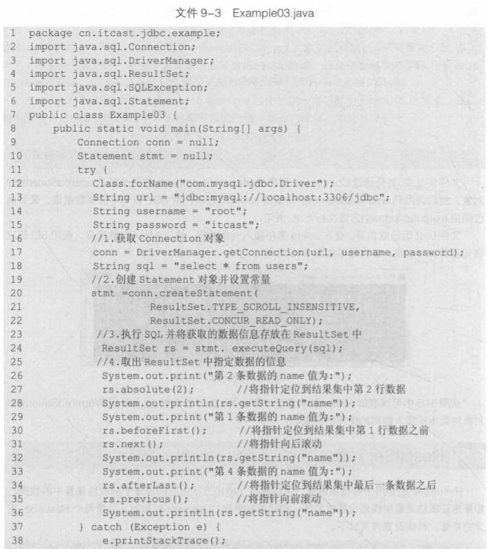 ResultSet rs = st.excuteQuery(sql);常量“ResultSet.TYPE_SCROLL_INSENITIVE”表示结果集可滚动,常量“ResultSet.CONCUR_READ_ONLY”表示以只读形式打开结果集。