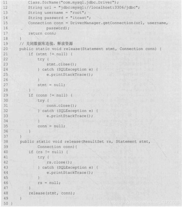 每次操作数据库结束后都要关闭数据库连接,释放资源,包括关闭ResultSet、Statement和Connection等资源。
