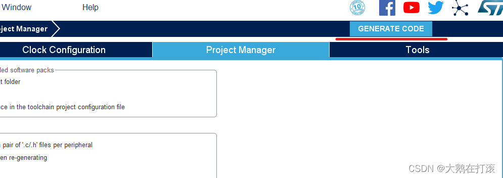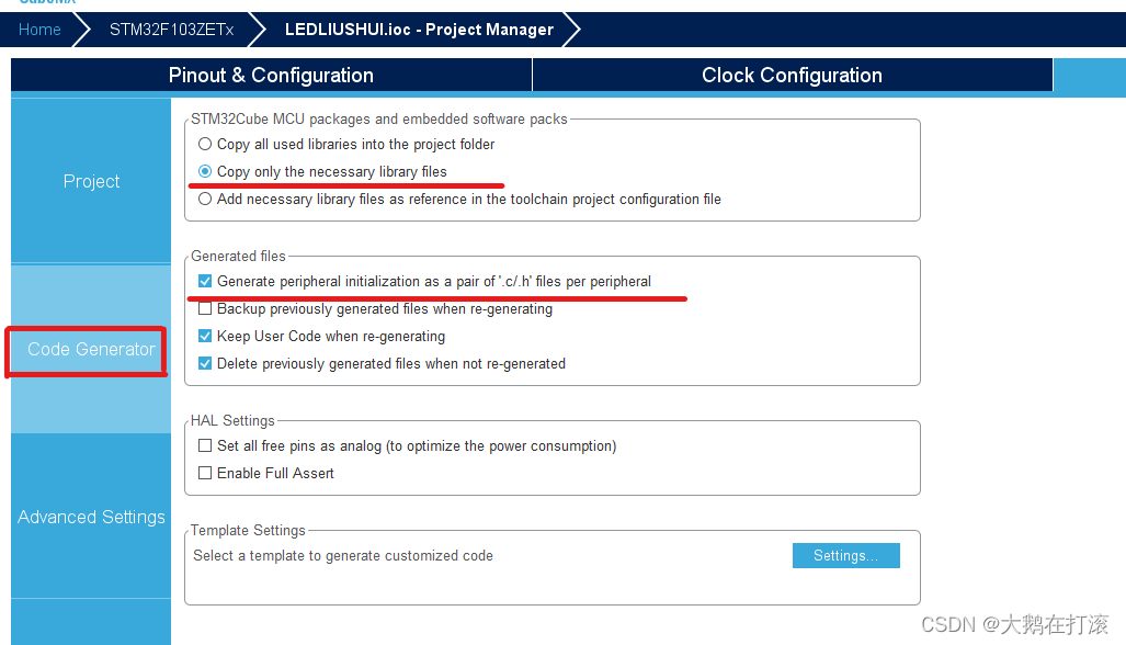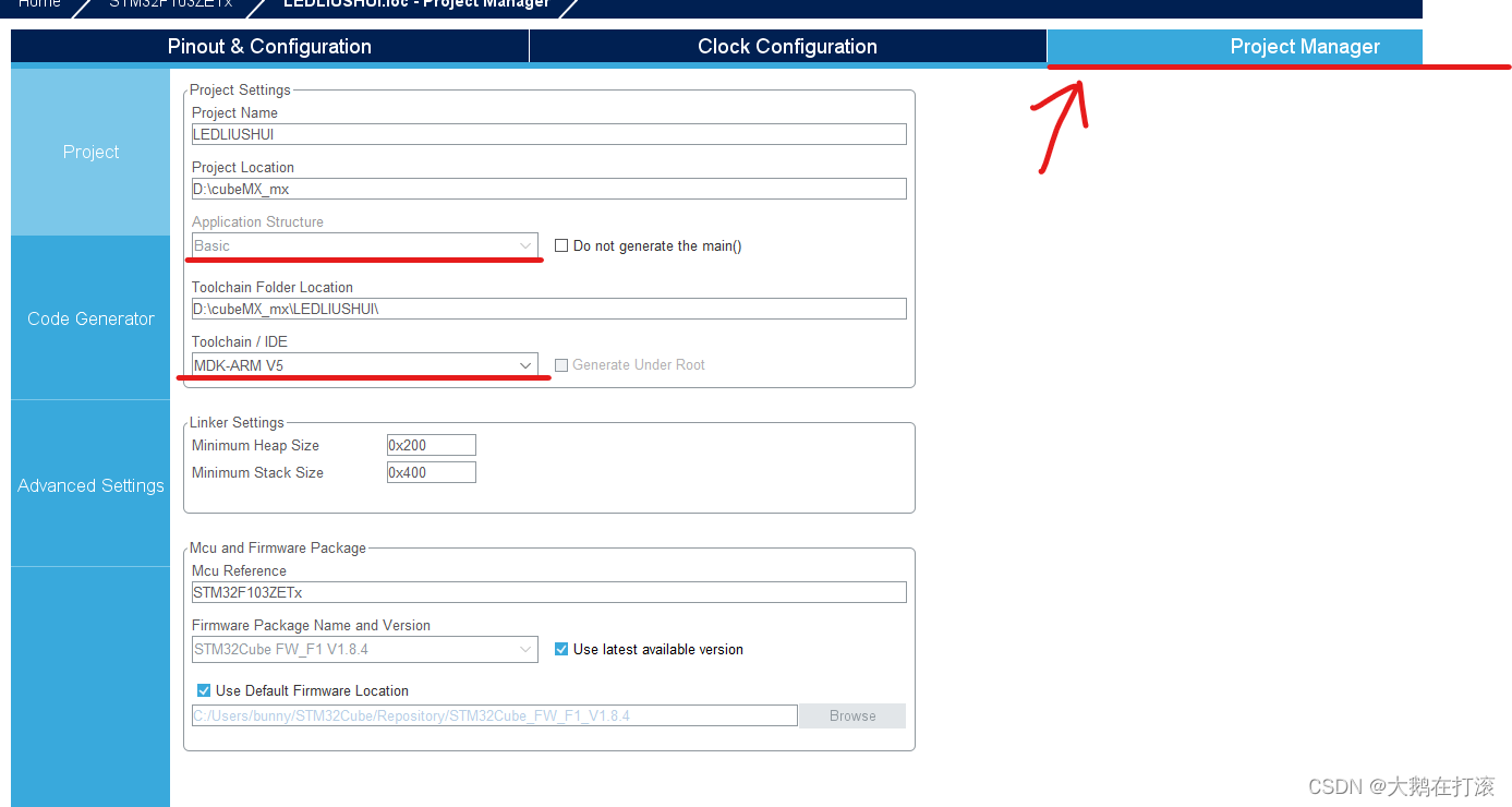 4.GPIO流水灯不需要对时钟进制配置,默认即可,点击Project Manager,注意对下面红线的配置