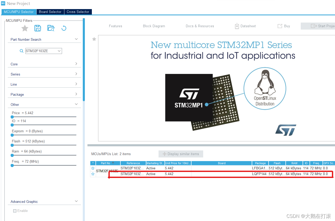 1.选择合适的芯片,左侧输入芯片型号,右侧选择LQFP144双击打开芯片配置