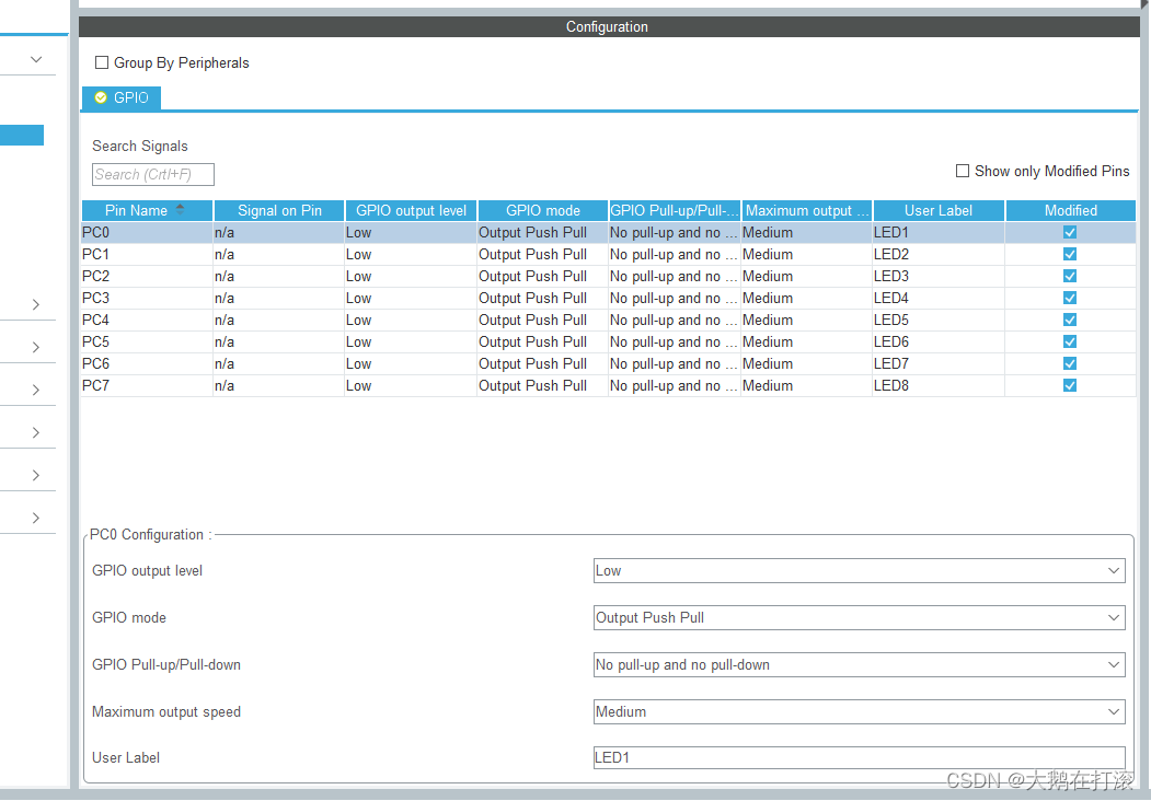 3.设置GPIO_PIN名及速率:双击展开设置卡片,选择想要的配置,实现流水灯的配置要求较低,可如下配置。注意user Label的命名会在keil代码中展现(不要随意命名)