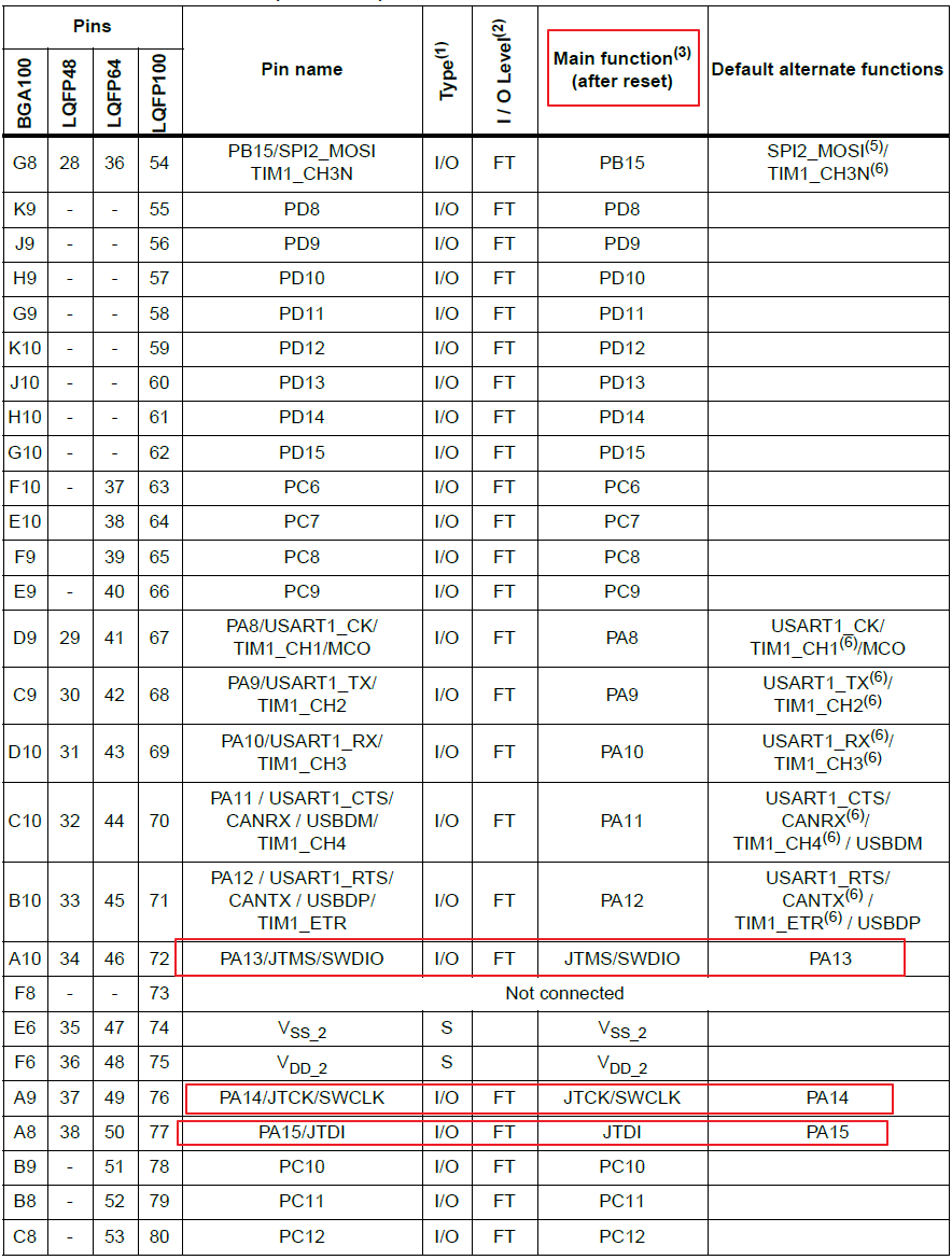 stm32的程序下载引脚涉及PB3、PB4、PA13、PA14、PA15,其中PA13,PA14分别作为SWD调试的SWIO和SWCLK。PB3,PB4,PA13,PA14,PA15共同用于JTAG调试。