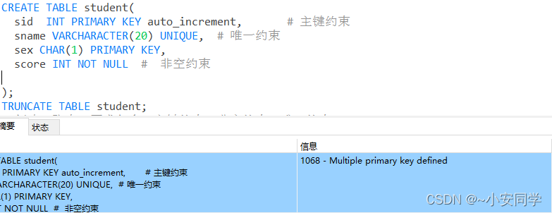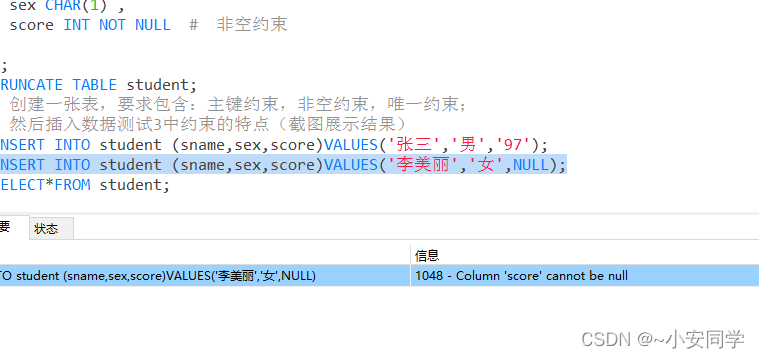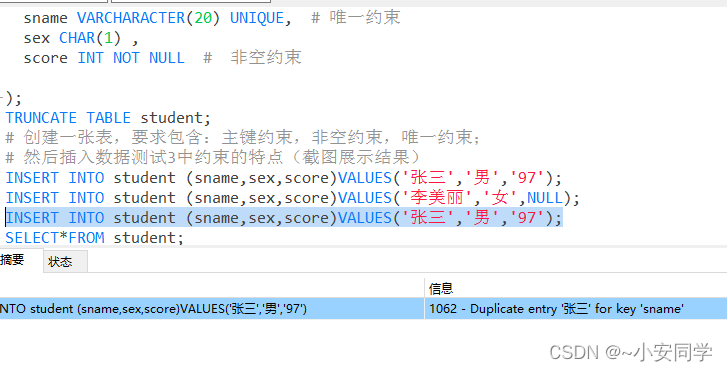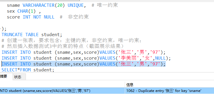 1 创建一张表,要求包含:主键约束,非空约束,唯一约束;然后插入数据测试3中约束的特点(截图展示结果)