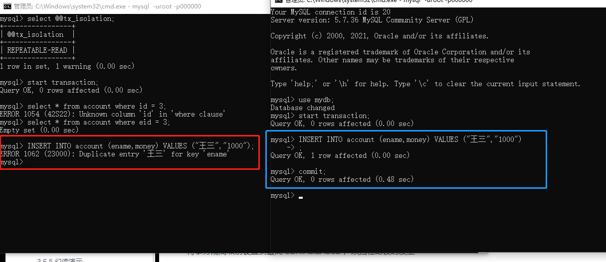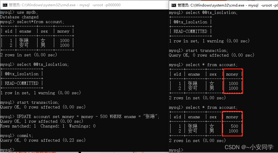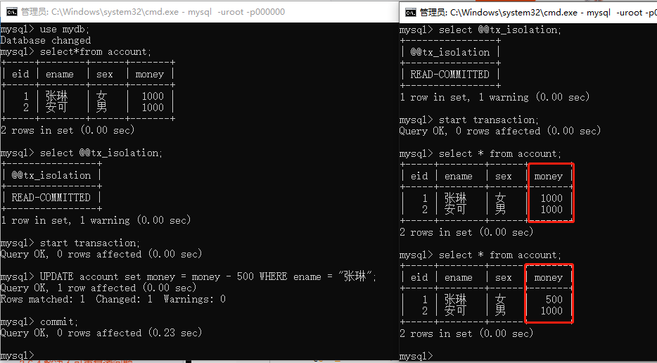 2 使用转账案例,或者其他案例,模拟演示脏读,不可重复读,幻读,并给出解决方案(幻读除外),截图展示结果。