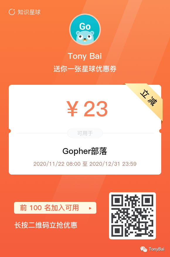 “Gopher部落”星球首开,福利自然是少不了的!2020年年底之前,8.8折(很吉利吧^_^)加入星球。扫描下方图片二维码即享优惠!