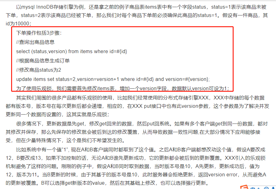 如上图所示,如果更新操作顺序执行,则数据的版本(version)依次递增,不会产生冲突。但是如果发生有不同的业务操作对同一版本的数据进行修改,那么,先提交的操作(图中B)会把数据version更新为2,当A在B之后提交更新时发现数据的version已经被修改了,那么A的更新操作会失败。