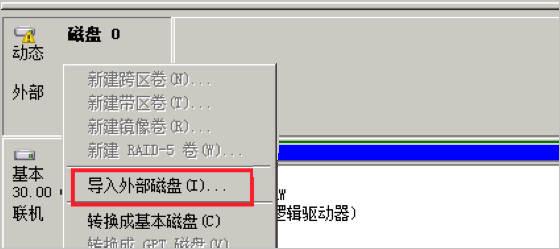 在外部磁盘处,右键单击右边的空白处,选择导入外部磁盘,再单击确定。