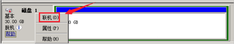 在脱机磁盘处,右键单击磁盘名称(如上图中的磁盘1)周边的空白区,在弹出的菜单中,选择联机,再单击确定。