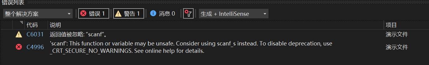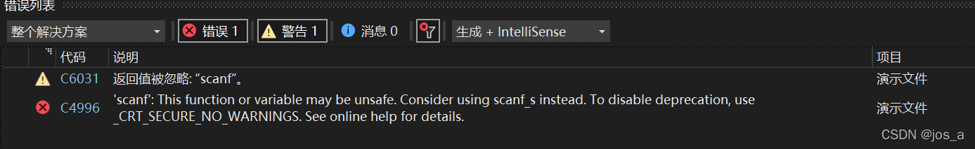 我们可以看到C4996提示scanf不安全,建议使用scanf_s代。如果你要不想再出现报错请使用 _CRT_SECURE_NO_WARNINGS