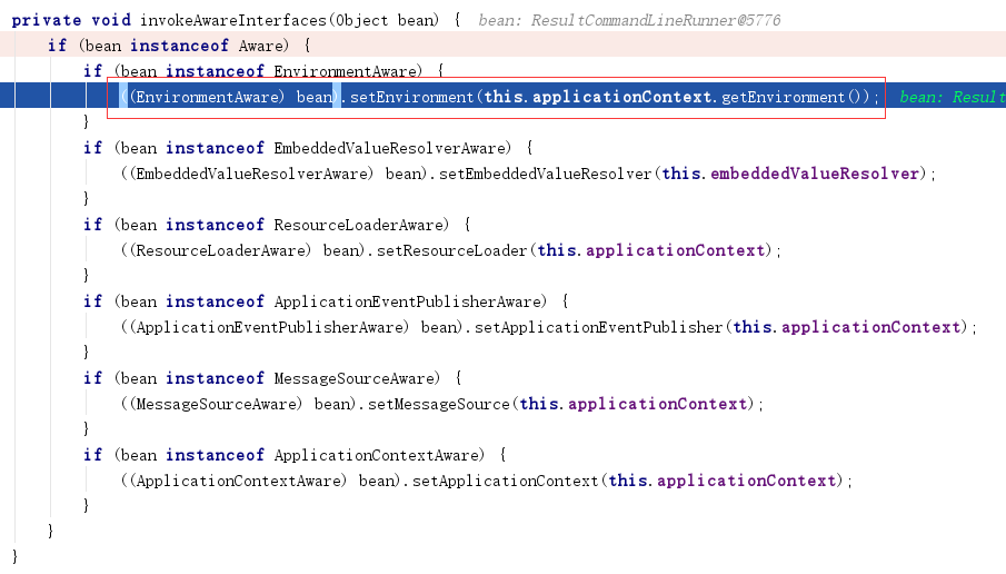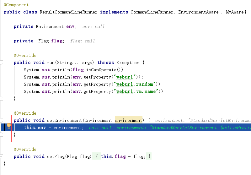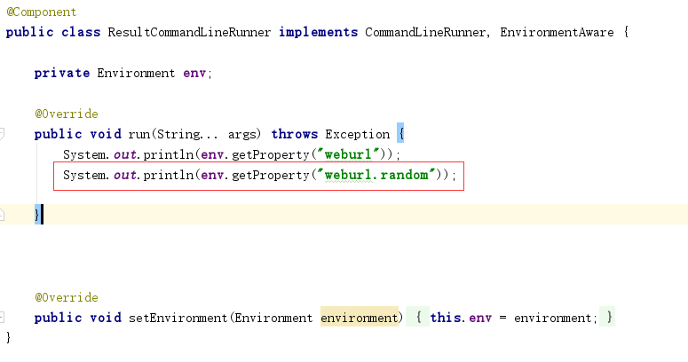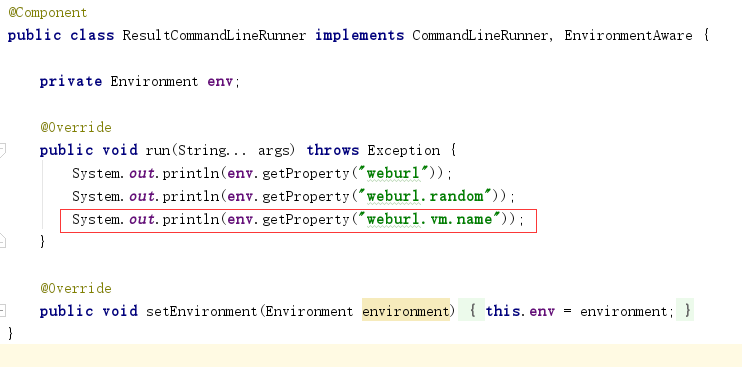 我们以ResultCommandLineRunner启动类加载器为例。实现了EnvironmentAware接口,目的就是为了获得environment,从而打印属性