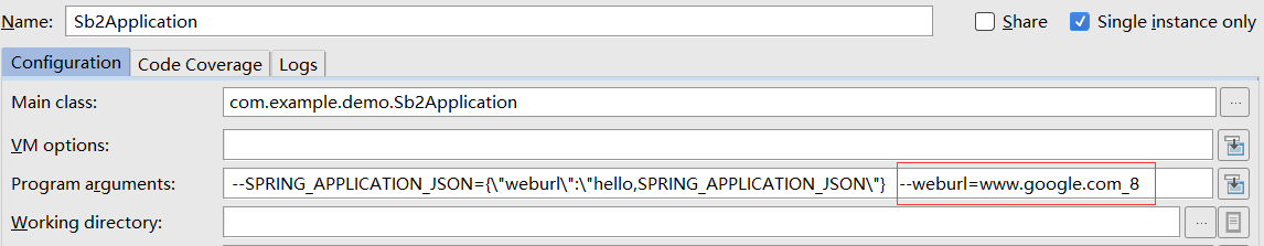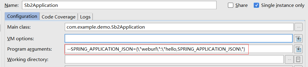 增加参数--SPRING_APPLICATION_JSON={\"weburl\":\"hello,SPRING_APPLICATION_JSON\"}