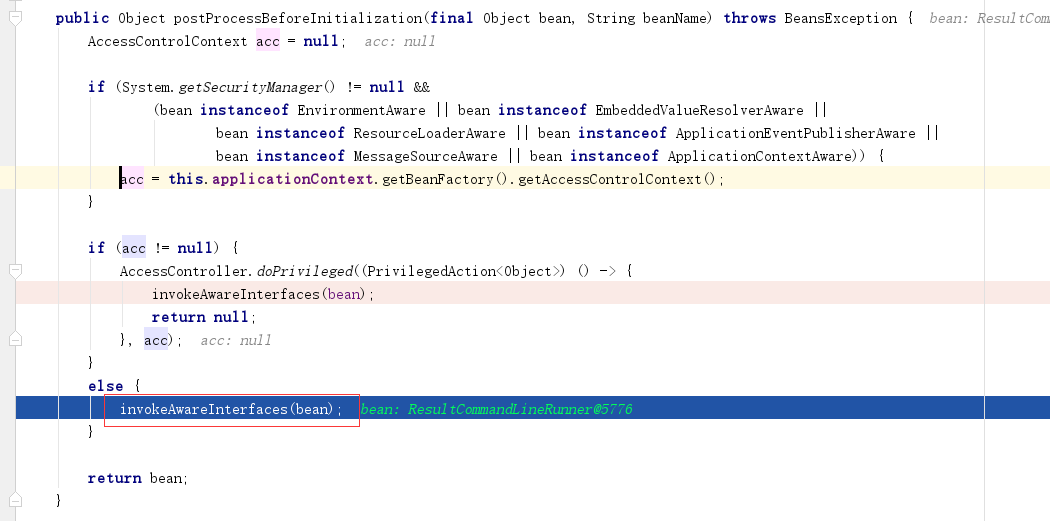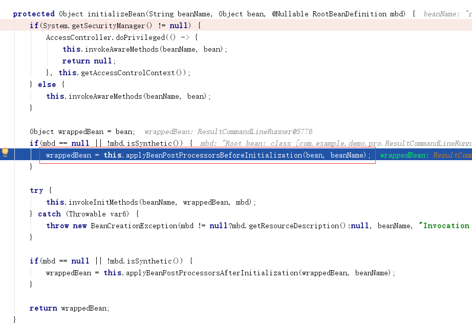2、进入initializeBean。beanName为resultCommandLineRunner(可以根据beanName设置条件断点)下面是initializeBean的方法