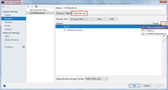 方法1:将Free Spire.Doc for Java包 下载 到本地,解压,找到lib文件夹下的Spire.Doc.jar文件。然后在IDEA中打开“Project Structure”界面,然后执行如图步骤来手动导入本地路径下的jar文件: