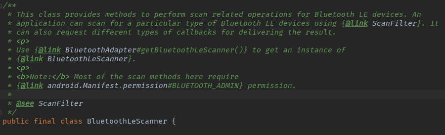 言归正传,我们来分析BluetoothLeScanner的源码。我们先来看看这个类的注释: