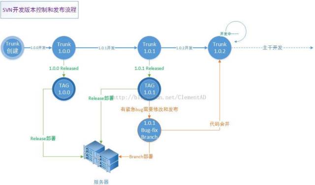 这是一种很标准的开发模式,很多的公司都是采用这种模式进行开发的。trunk永远是开发的主要目录。