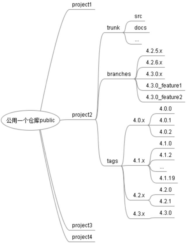 Subversion有一个很标准的目录结构,是这样的。比如项目是 proj,svn地址为 svn://proj/,那么标准的 svn 布局是: