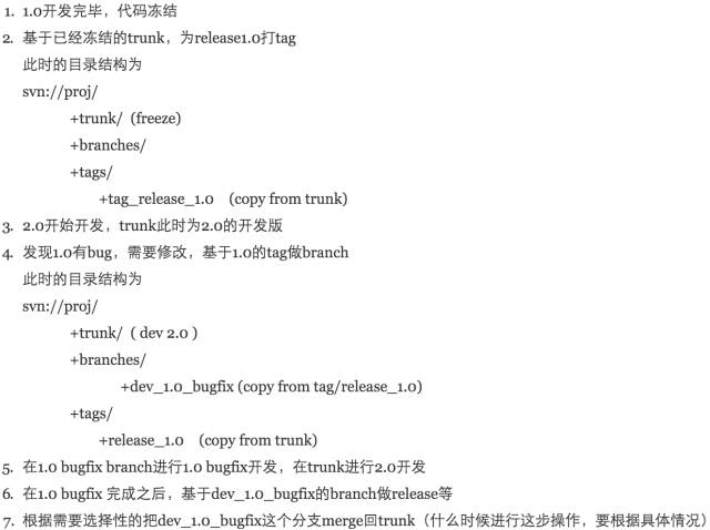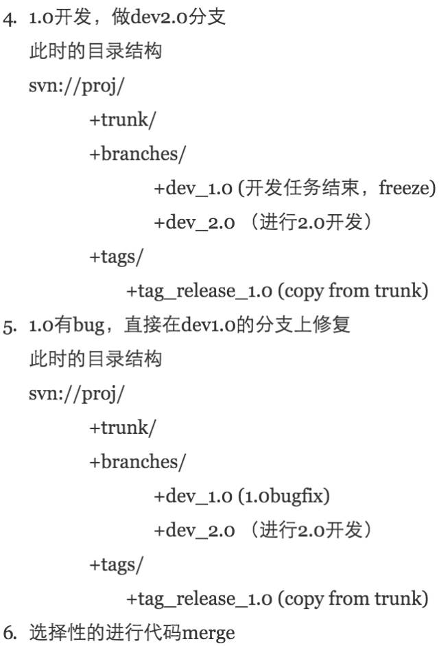 所以,第六步进行选择性的merge,是可以当2.0开发结束后一起把dev_1.0(bugfix用)和dev_2.0(新版本开发用)merge回trunk。或者先把dev_1.0 merge到dev_2.0,进行测试等之后再merge回trunk。