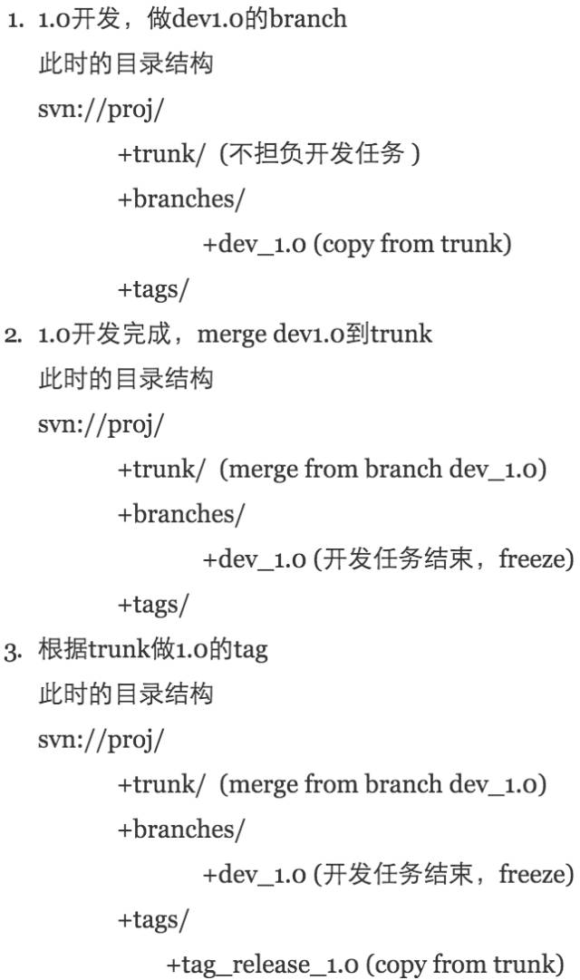 这种开发模式当中,trunk是不承担具体开发任务的,主要承担版本发布,一个版本/阶段的开发任务在开始的时候,根据已经release的版本做新的开发分支,并且基于这个分支进行开发。还是举上面的例子,这里面的时序关系是。
