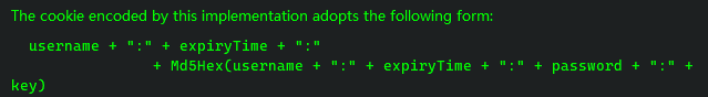 // 下面函数中的核心代码: String data = username + ":" + tokenExpiryTime + ":" + password + ":" + getKey();