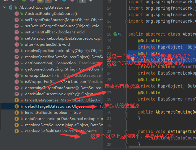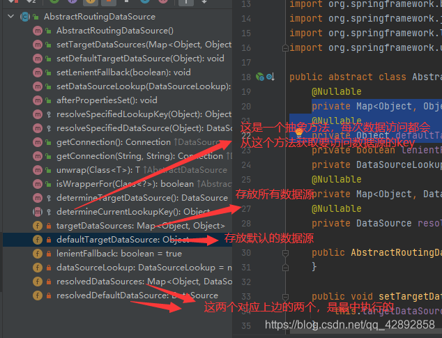 spring的动态数据源核心类AbstractRoutingDataSource里保存了数据源的连接信息,所以我们想定义适应当前项目的多数据源配置也是去修改spring的这个类。如下图,就是AbstractRoutingDataSource类,可以知道:
