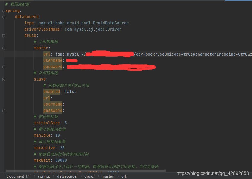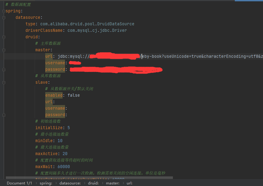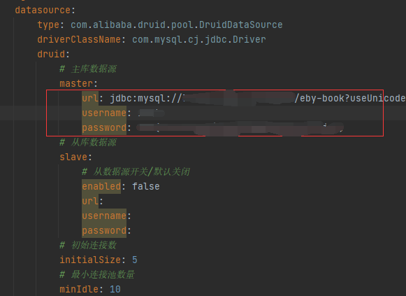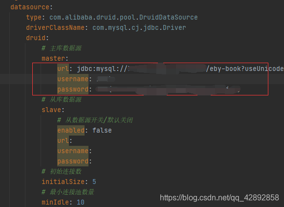- @ConfigurationProperties("spring.datasource.druid.master") 在方法上使用@ConfigurationProperties,会将参数设置到返回的对象中。这里就是设置的url,name,password