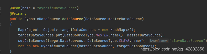 }- 可见这是方法作用是生成一个bean,那么肯定会有地方会引入这个bean.往下翻 dataSource()就引用了masterDataSource生成的bean,而dataSource方法生成了DynamicDataSource bean,这个bean就是我们最终要修改的bean.