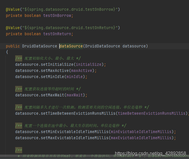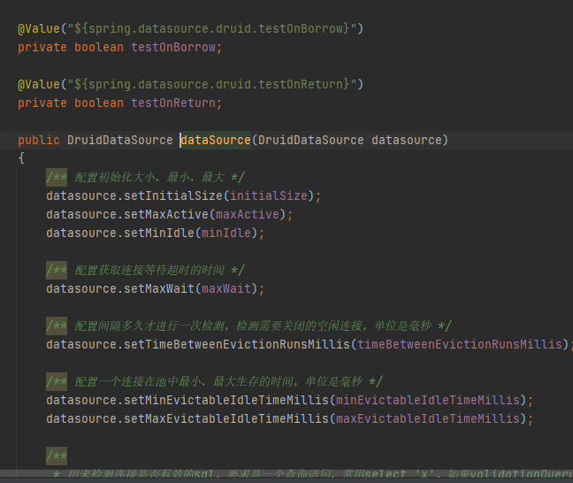 DruidDataSource druidDataSource = druidProperties.dataSource(dataSource); 就是给drui数据源设置相关的参数。首先知道 druidProperties是一个bean,所有我们去调用这个方法,也要先获得这个bean,在去给我们新建的数据源设置参数。