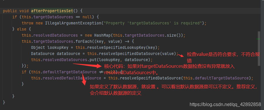 afterPropertiesSet()方法,将targetDataSources内容放入到resolveDataSources中:
