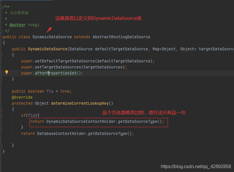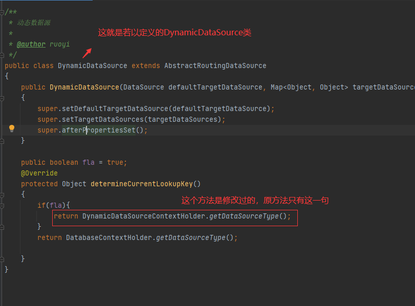 如果因为不了解ruoyi,觉得上边的配置复杂,可以好好读一下这个方法,就能更深入的了解了。可以把这个方法看作和外界唯一的接口,如果要操作数据,就要先通过这个接口获取数据源。甚至可以重写这个方法,让它根据我们的逻辑返回数据源。反正我们只要返回一个数据源就可以了!!!