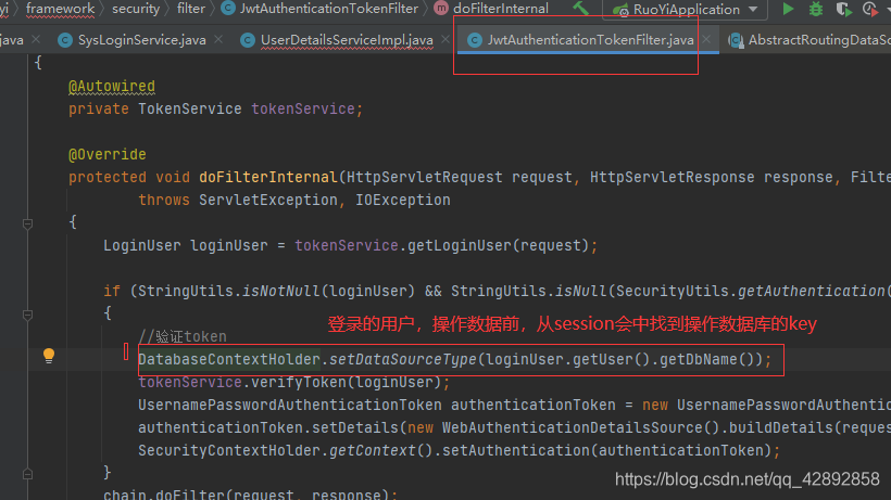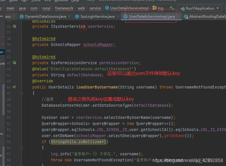 - 当用户登录前调用DatabaseContestHolder.setDataSourceType(),将contextHolder的值设置成defaultDatabase,这样就会到默认库实现Security中登录逻辑。并且将用户对应的数据库源的key值放入seesion中