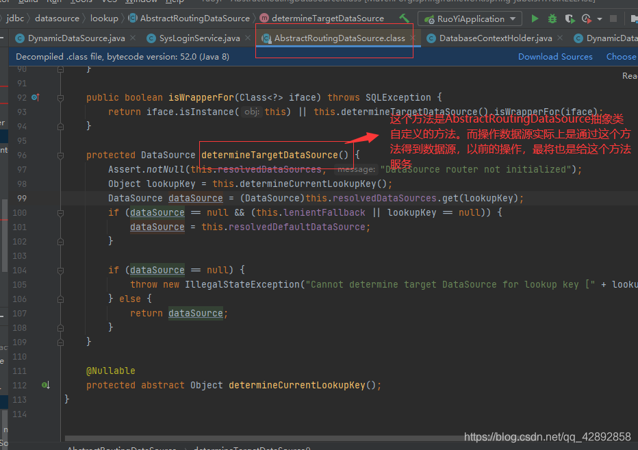 - determineCurrentLookupKey() 方法能返回要操作数据源的key。而这是一个抽象方法,需要自定义实现。