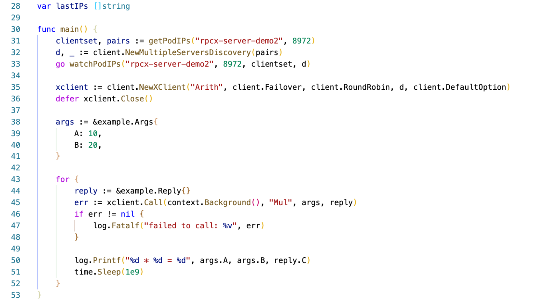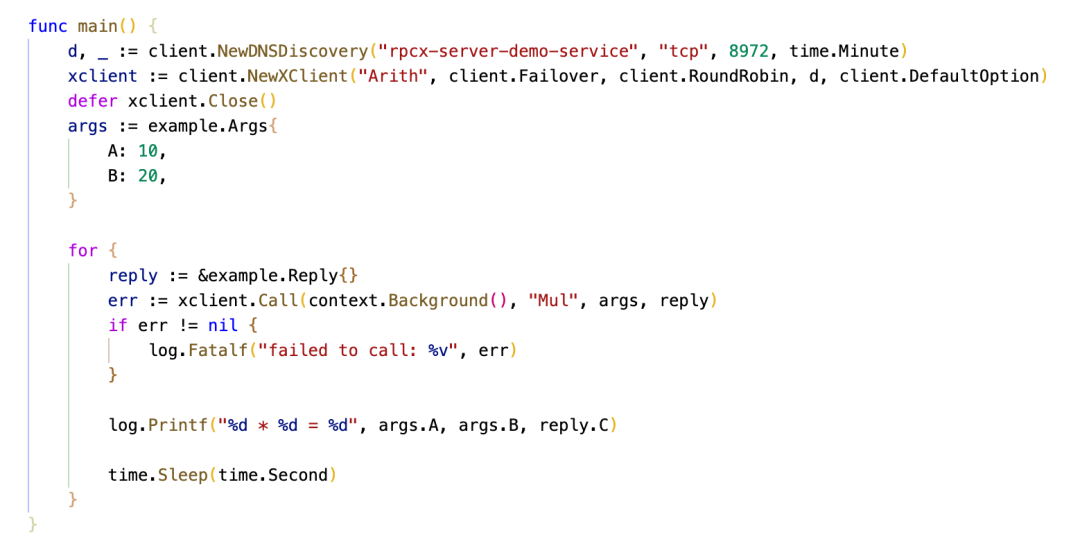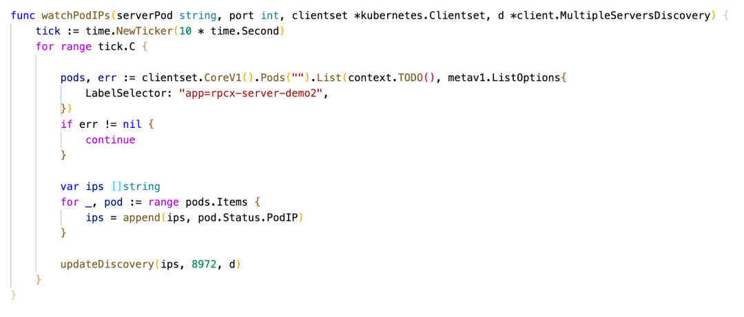 rpcx本身支持DNS的方式,如下图所示只需要把DNS的名称传进去,得到Pod的IP地址,之后再得到Pod的对外容器端口“8972”就可以进行调用了。服务器会定时查询DNS,如果发现DNS下面的节点有变化,比如其中一个Pod被下掉或者被迁移到其他节点上,可以马上获取到最新的节点信息。