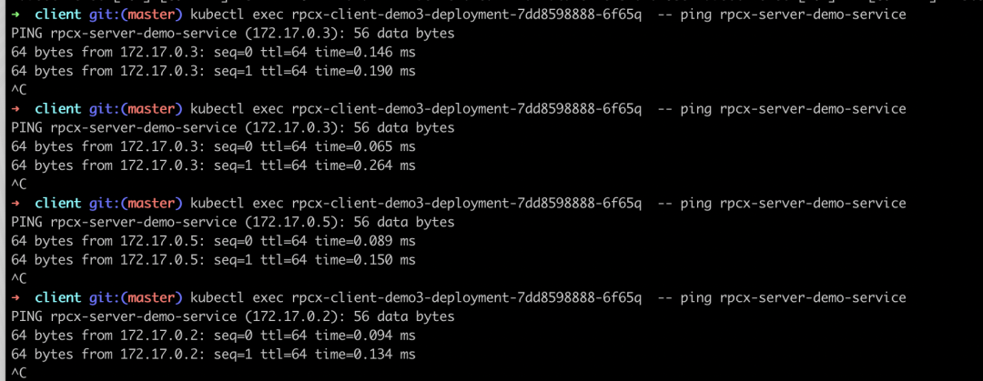 直接使用服务的名称也可以访问。如下图演示,执行三次client端容器的ping服务,访问的分别是0.3、0.3、0.5,因此可以发现Pod的地址是随机的,不会固定在同一个地址上。