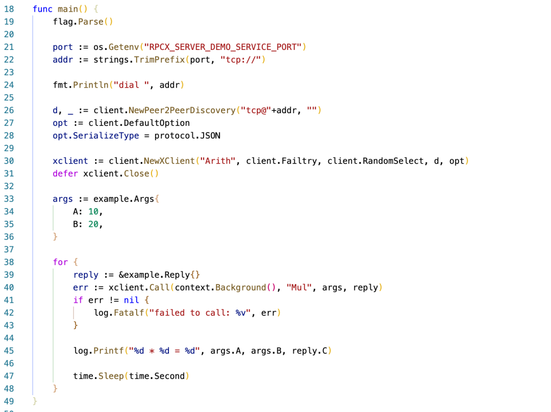 接下来是rpcx的配置。下图中服务的class IP和端口写出来后续都是rpcx的正常调用方法,调用的是算术乘法服务。把参数10和20填进去就可以不断循环调用这个服务,也可以查看log日志。通过环境变量的方式得到Pod形成的Service地址,Service会把相应的请求转到对应的Pod上。