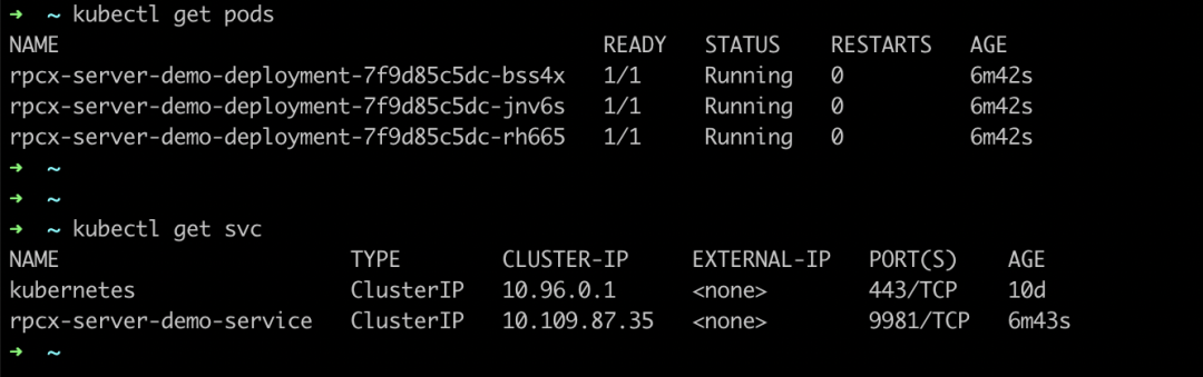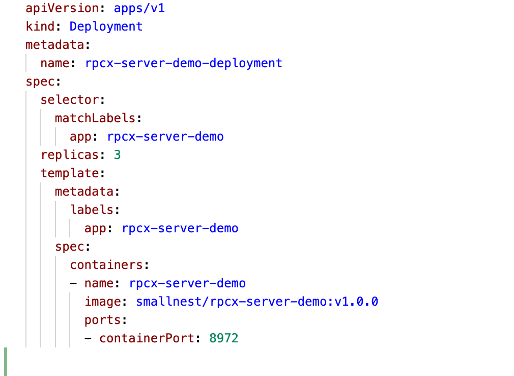 下图所展示的是定义了一个服务端的应用rpcx-sever-demo。以rpcx传统的微服务框架如何在云原生环境下进行服务发现来举例,图中显示服务端应用的副本是3,在发布Pod或者应用的时候,会取三个Pod提供服务。使用的镜像是比较简单的服务端测试程序,用来实现基本乘法,定义其端口为8972,继而使用命令把应用发布出去。