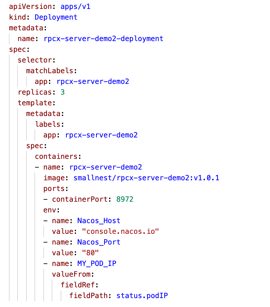 以nacos为例,在服务端程序启动的时候要把服务平台的信息通过环境变量的方式告诉服务端程序。图中把nacos的主机名、端口写出来,服务端通过环境变量就可以知道到去哪个nacos平台注册。服务端还需要把自己的Pod信息注册上去,因为在这种情况下其他rpcx的client就可以得到Pod的信息,通过这种方式得到机器的Pod IP地址放在环境变量里。