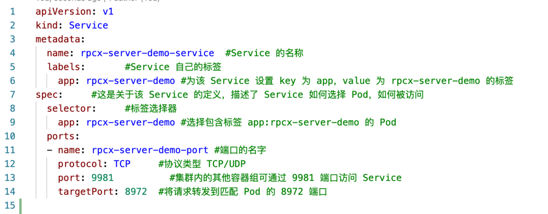因为是使用环境变量的方式,所以接下来必须定义一个服务。下图服务的名称是rpcx-server-demo-service,使用的应用是上述定义的rpcx-server-demo应用,服务的端口是9981,集群内的其他容器组可以通过9981去访问Service,然后Service会把请求转到相应的port 8972的端口上,通过命令就可以把这个服务发布出去。