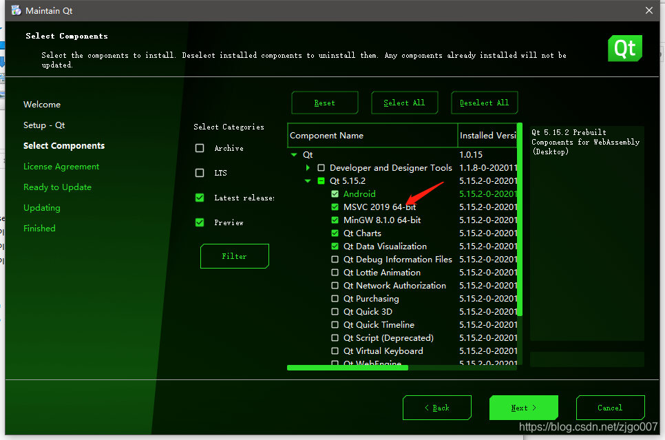 安装Qt5.15.2(只能在线安装),安装时候注意勾选MSVC 2019 64-bit支持,其他的根据自己需要勾选,点击下一步等待Qt安装完毕,此时QtCreator中Kits里Desktop Qt 5.15.2 MSVC2019 64bit编译环境前端有黄色感叹号,无法使用,需要安装MSVC2019支持