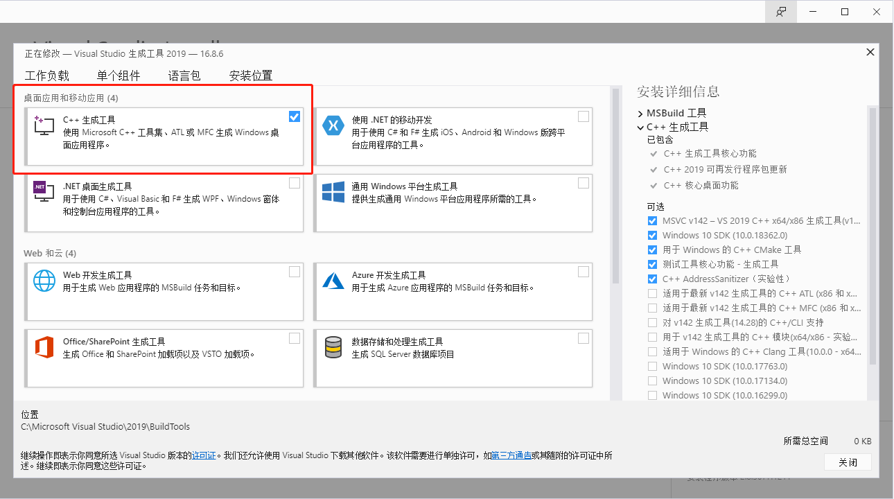 依次下载完成后,先安装 Visual C++ 库运行组件,然后再安装 Visual Studio 2019生成工具(需要联网安装),勾选C++生成工具(右侧自定义勾选使用默认即可,可自行设置安装位置等)进入安装,此时安装器进行联网安装,等待安装完成即可。