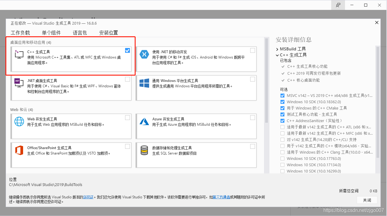 Visual C++ 库运行组件在<其他工具和框架>中,Visual Studio 2019生成工具在<Visual Studio 2019 工具>中