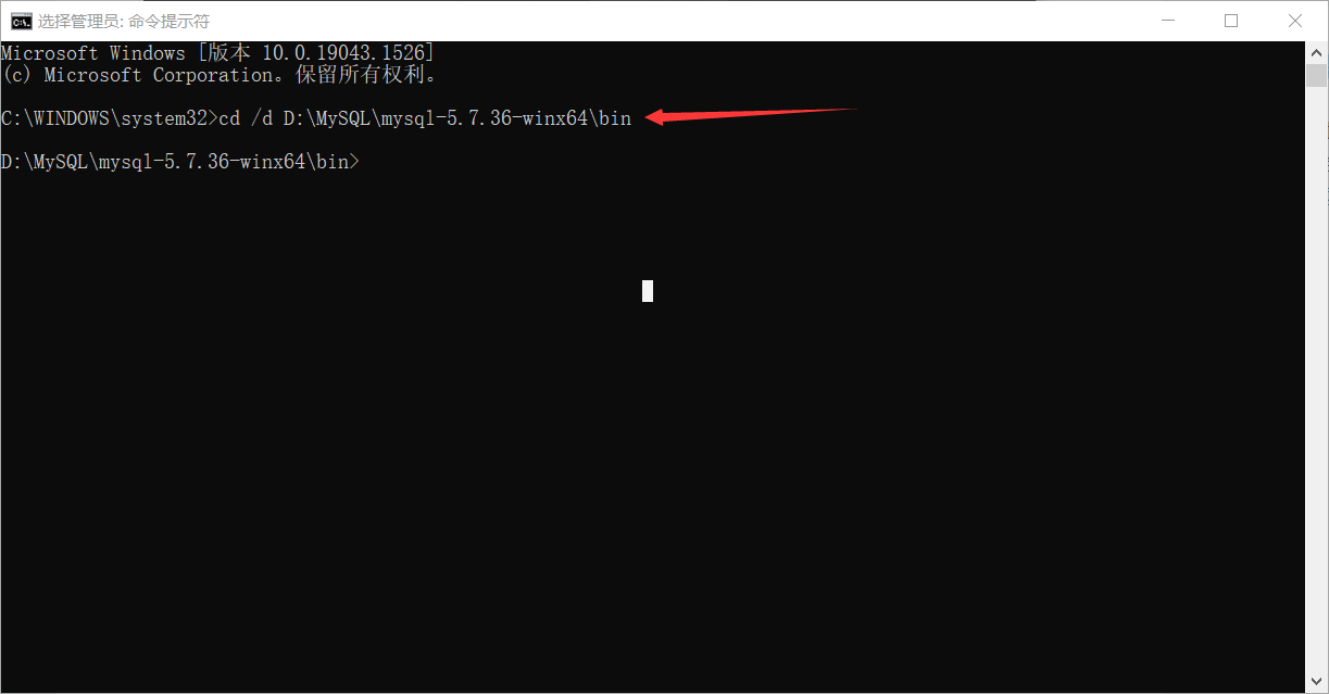 2.使用 cd /d D:\MySQL\mysql-5.7.36-winx64\bin 进入bin目录下