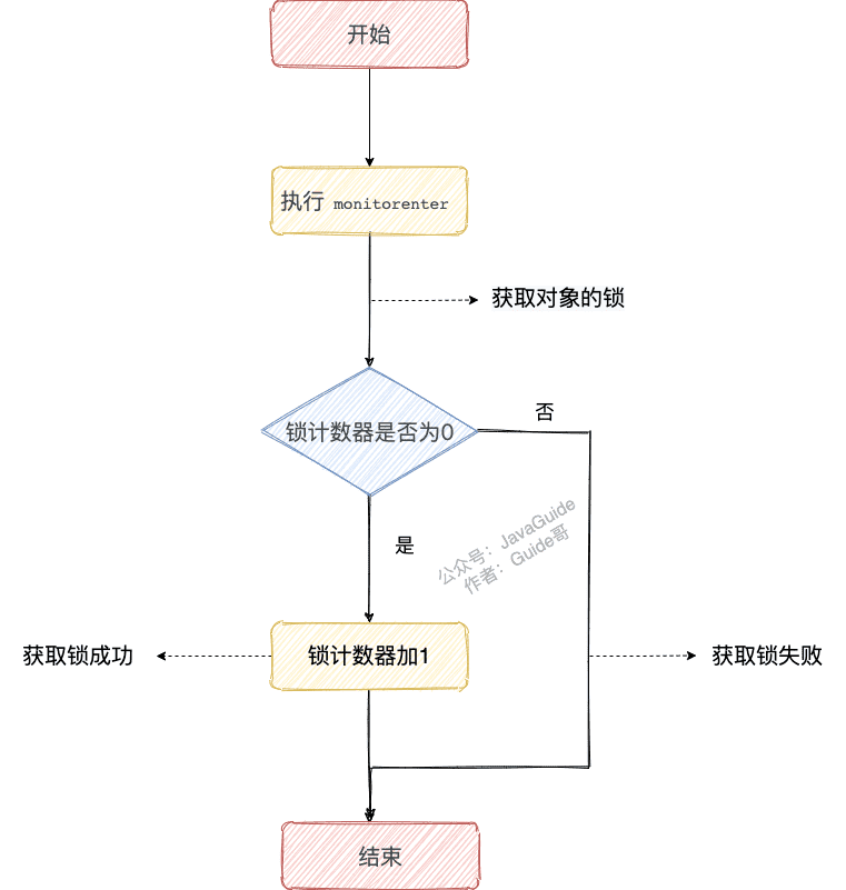 在执行monitorenter时,会尝试获取对象的锁,如果锁的计数器为 0 则表示锁可以被获取,获取后将锁计数器设为 1 也就是加 1。
