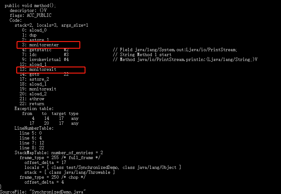 从上面我们可以看出:synchronized 同步语句块的实现使用的是 monitorenter 和 monitorexit 指令,其中 monitorenter 指令指向同步代码块的开始位置,monitorexit 指令则指明同步代码块的结束位置。