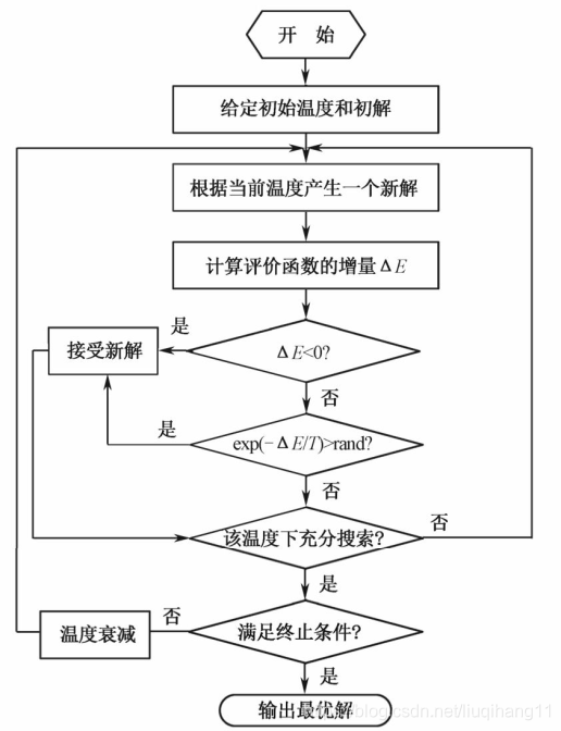 用固体退火模拟组合优化问题,将内能E模拟为目标函数值,温度T演化成控制参数,即得到解组合优化问题的模拟退火算法:由初始解X1和控制参数T的初值T0开始,对当前解重复“产生新解→计算目标函数差→接受或舍弃”的迭代,此迭代过程模拟的是在给定温度下物体达到热平衡的过程;在给定温度达到热平衡后,再逐步减小T值,重新进行热平衡迭代直到达到终止条件。算法终止时的当前解就是近似最优解。