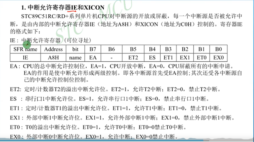 中断允许寄存器IE:从stc手册得到的。IE寄存器他是一个中断允许寄存器。