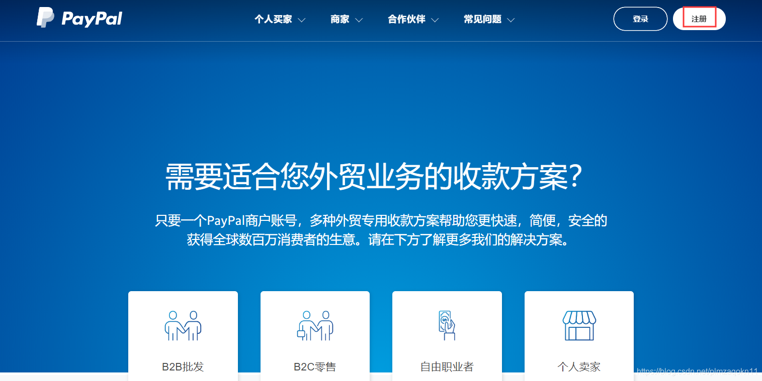 浏览器中输入:https://www.paypal.com,点击 “注册“