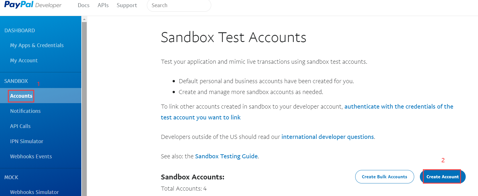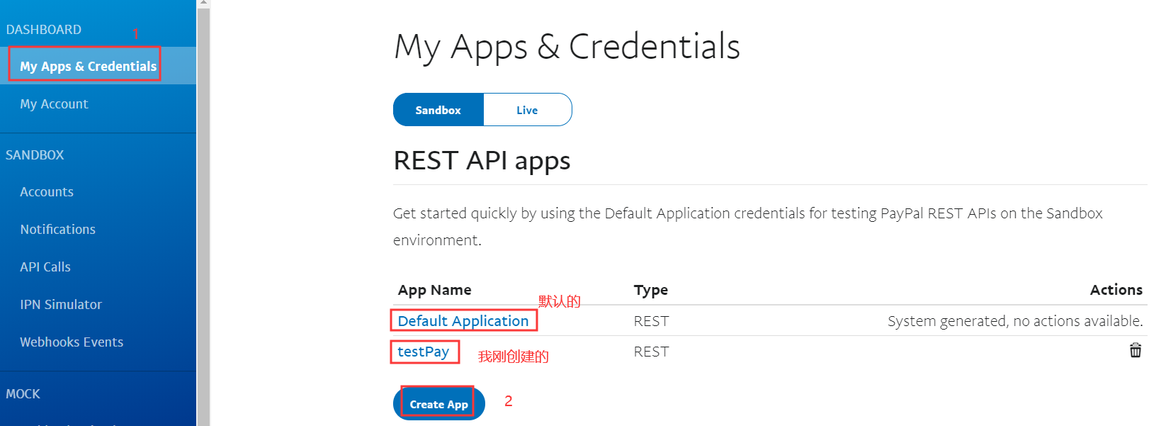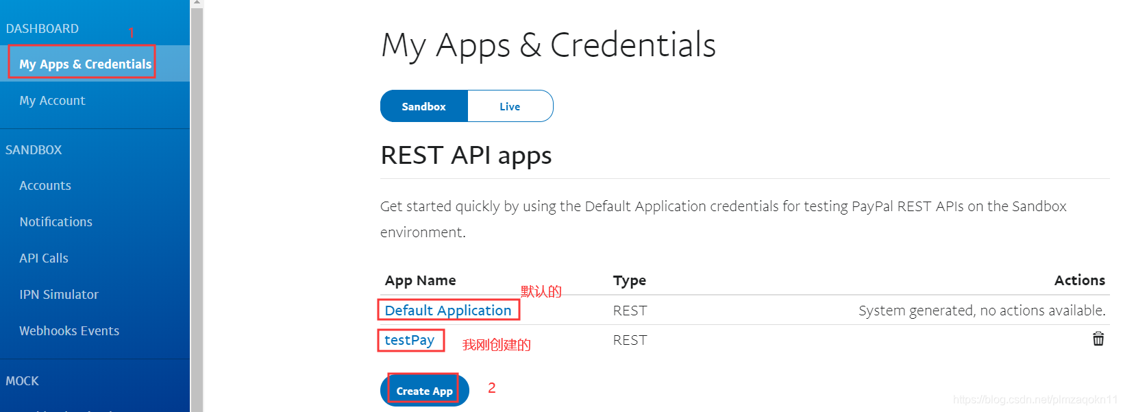 https://developer.paypal.com/ 开发者界面,用于创建沙盒环境