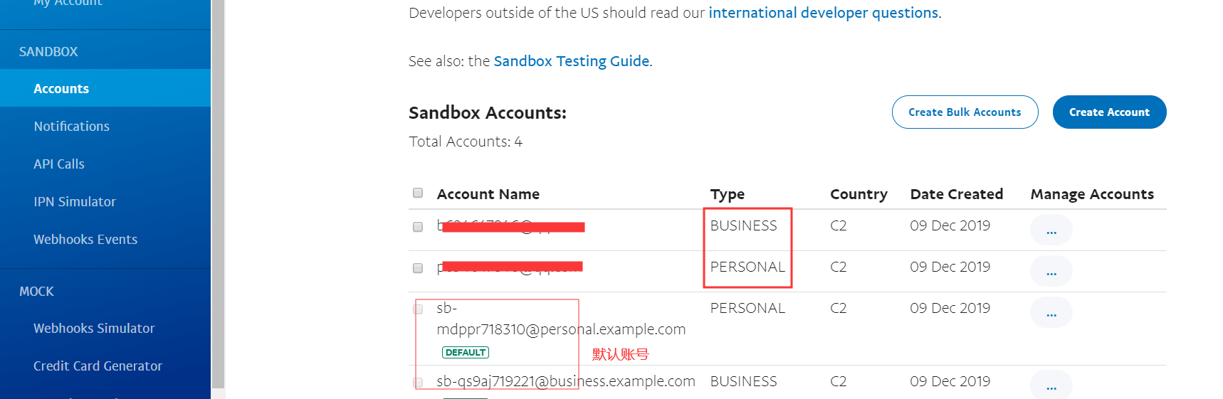 2、登录成功后进入以下界面,选择:SANBOX下的Accounts标签