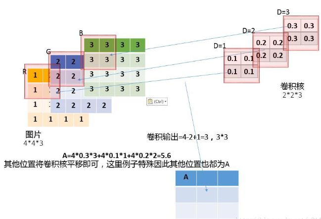 卷积核:卷积核大小为K*K,由于处理的图片是D通道的,因此卷积核其实也就是K*K*D大小的,因此对于RGB三通道图像,在指定kernel_size的前提下,真正的卷积核大小事kernel_size*kernel_size*3.