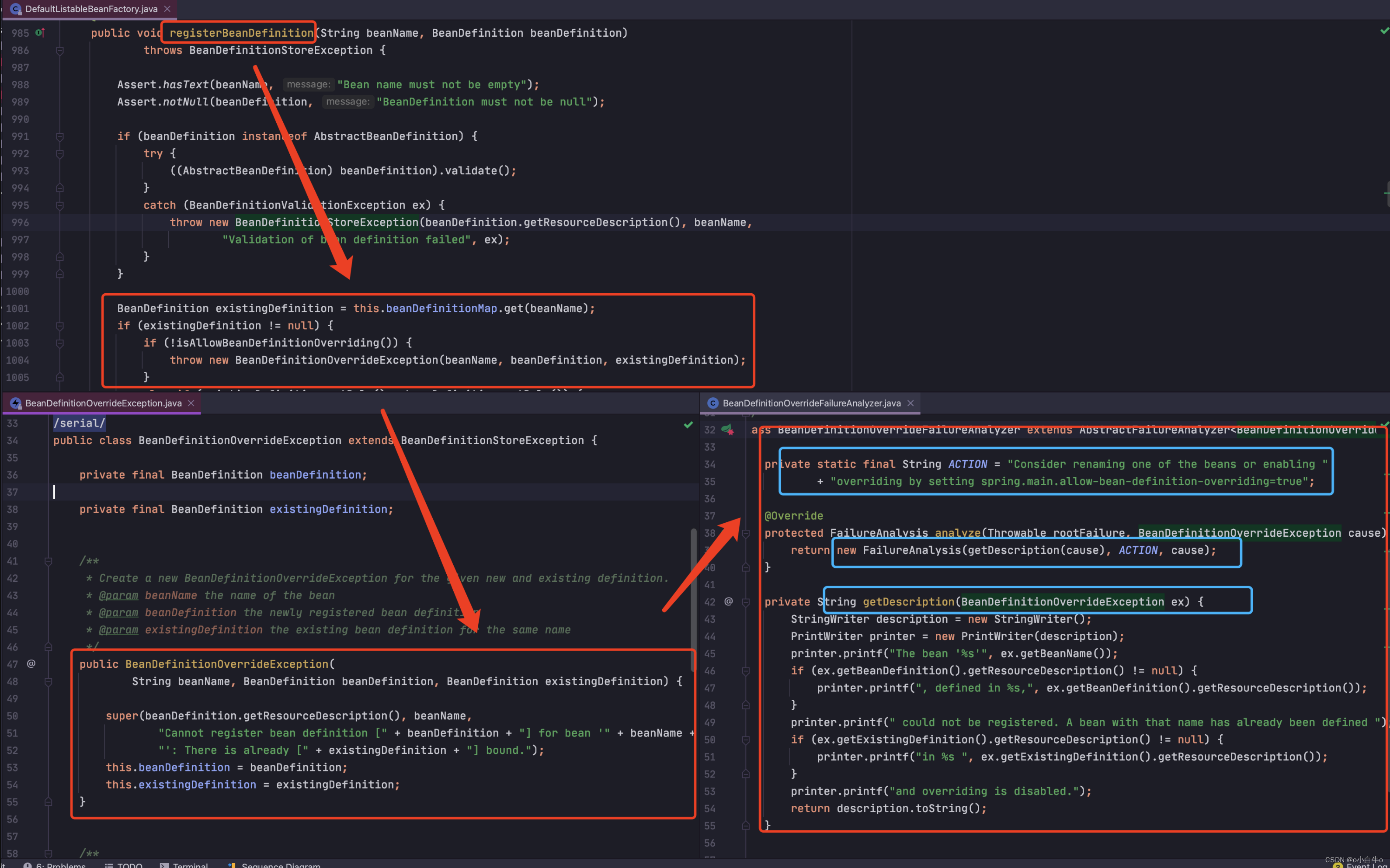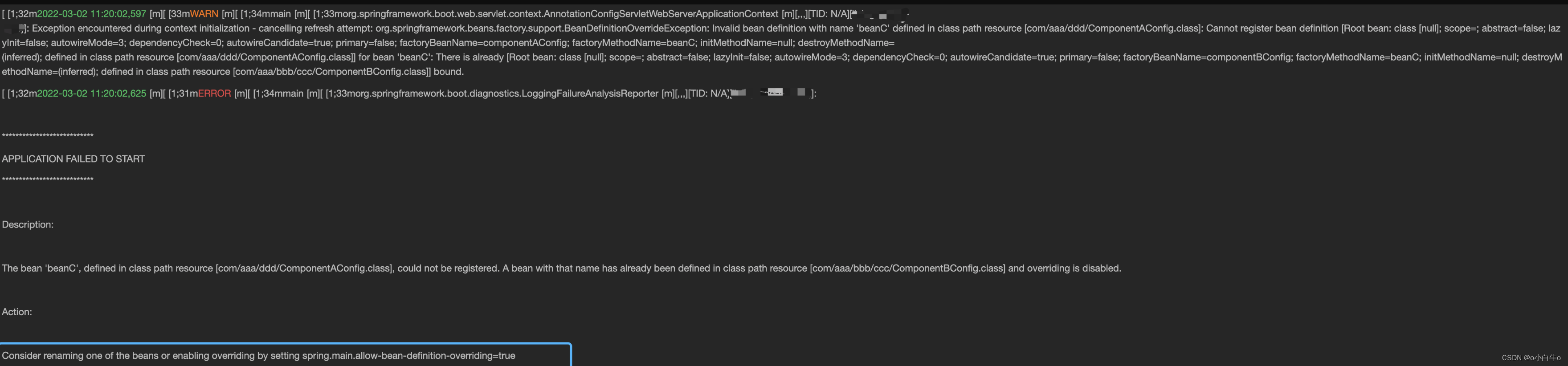 看了报错日志,然后再次查询了组件B的代码,才意识到,组件B也进行了BeanC的申明,然后基于报错文案,去spring源码里面一搜,发现原来spring对bean的注册做了如下的处理: